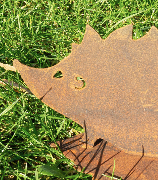 Riccio seduto su una foglia in corten