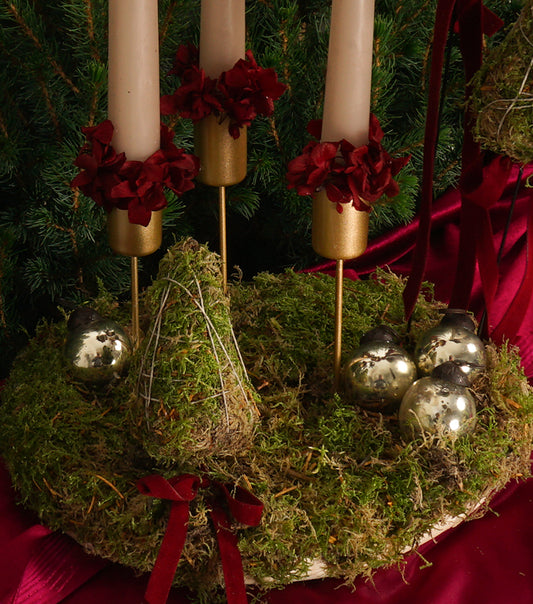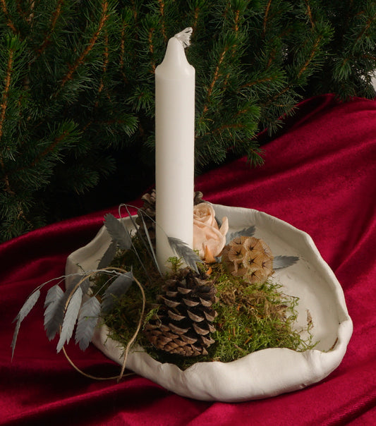 Candela Natalizia su terra cruda con Pigne, Muschio e piante