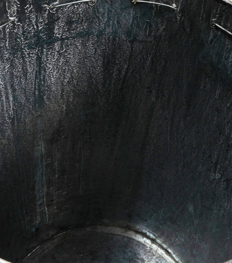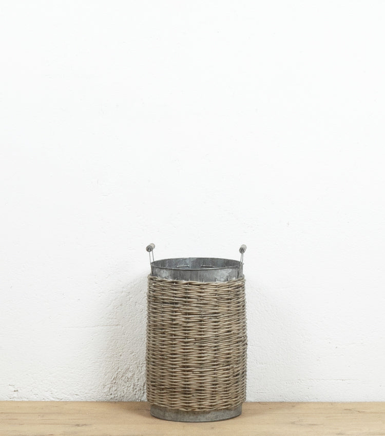 Secchio realizzato in latta rivestita con legno dallo stile vintage e rustico e manici anch'essi di legno.