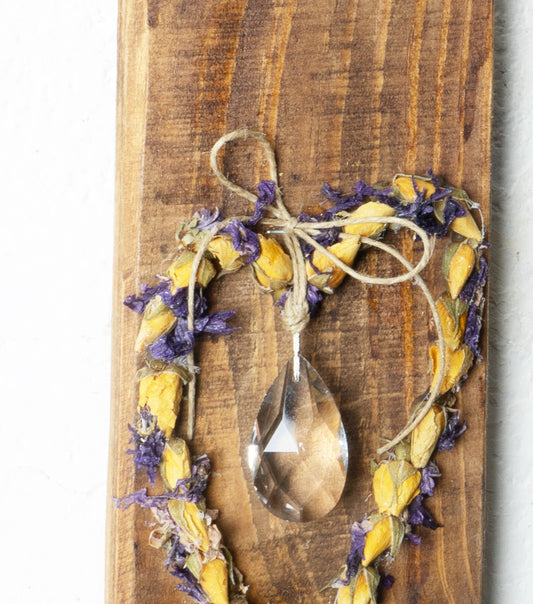 "Il Cuore sul Quadretto" in legno con fiori essiccati, una Perlina e spago