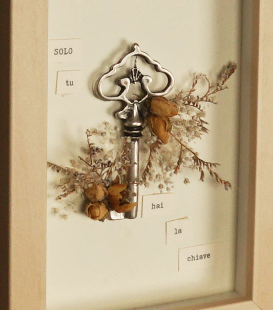 Cornice in legno "fortuna" con una Chiave in metallo e fiori essiccati