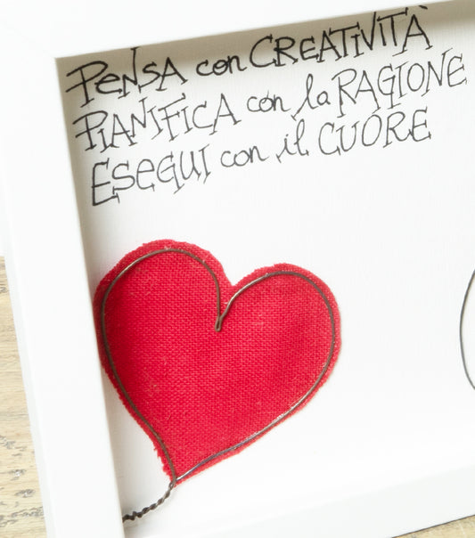 Cornice in legno con un Cuore, una Lampadina, un aforisma, fil di ferro e cotone