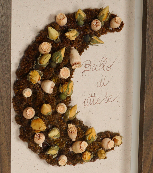 Cornice in legno "Brilla di attese" con una Mezzaluna di fiori essiccati