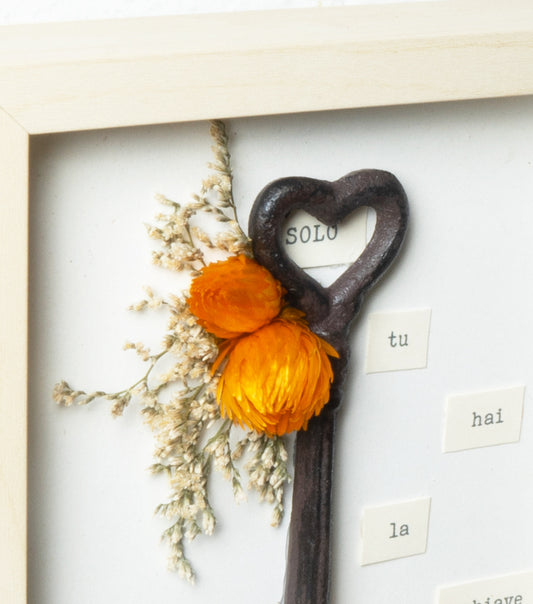 Cornice in legno piccola "SOLO tu hai la chiave" con una Chiave in metallo e fiori essiccati