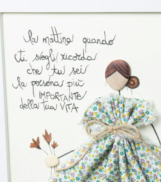 Cornice in legno con una Bambolina, sassi, cotone, spago, un aforisma, disegni e carta