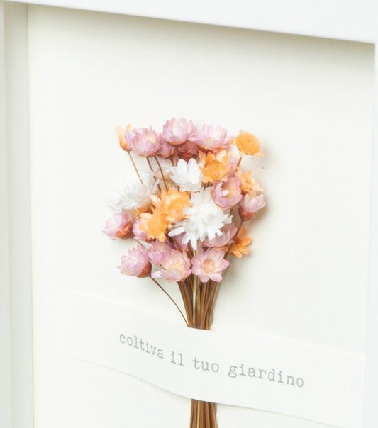 Cornice in legno "coltiva il tuo giardino" con un Bouquet di fiori essiccati e carta