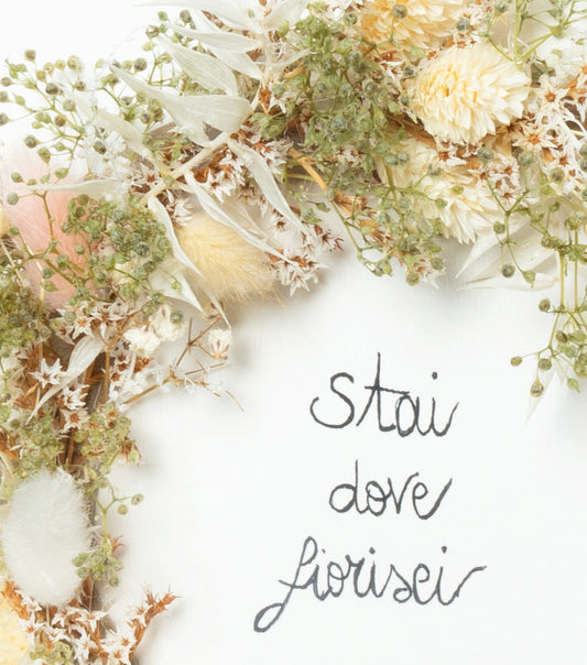 Cornice in legno "Stai dove fiorisci" con fiori essiccati e stabilizzati e carta