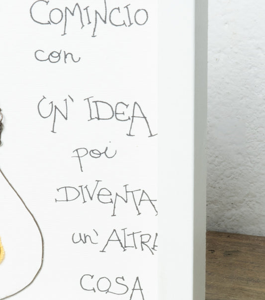 Cornice in legno con una Lampadina, un aforisma, fil di ferro e cotone