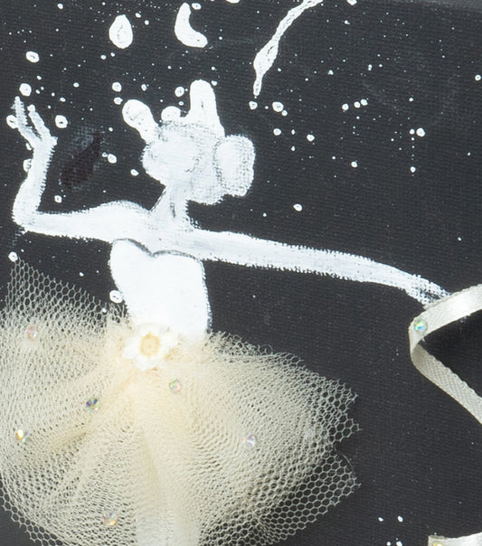 Quadro in tela con una Ballerina, tulle, un fiore essiccato, cotone e brillantini