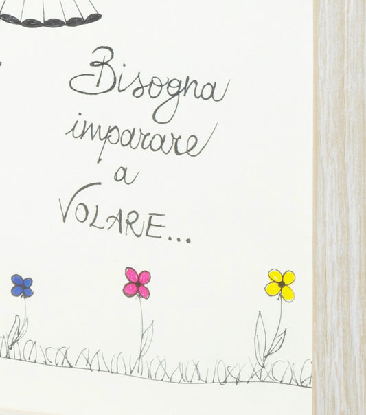 Cornice in legno e vetro "Bisogna imparare a VOLARE...* con Disegni e cotone