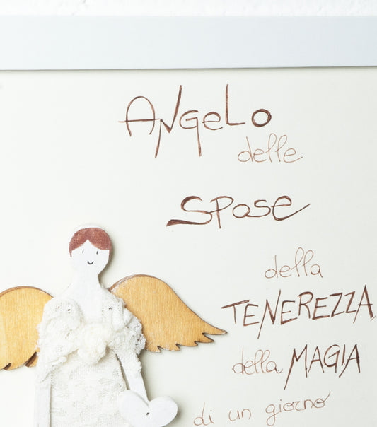 Cornice in legno con "l'Angelo delle Spose", un aforisma, pizzo e carta