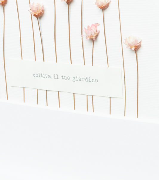 Cornice in legno "coltiva il tuo giardino" con fiori essiccati e carta piccola