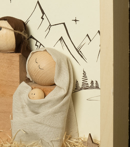 "La Natività nella Cornice" in legno con la paglia sintetica, Stelline in legno, Disegni, carta, cotone e spago