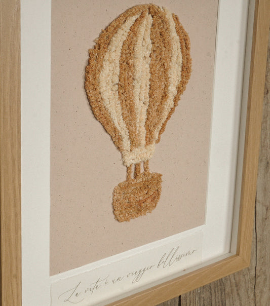 Cornice in legno "La vita è un viaggio bellissimo" con una Mongolfiera di fiori essiccati