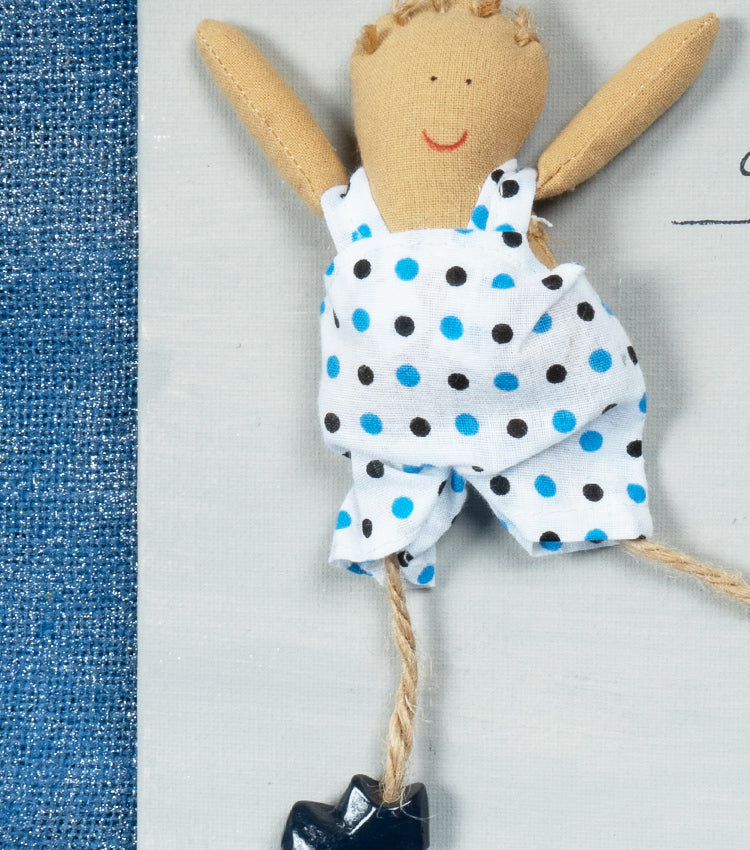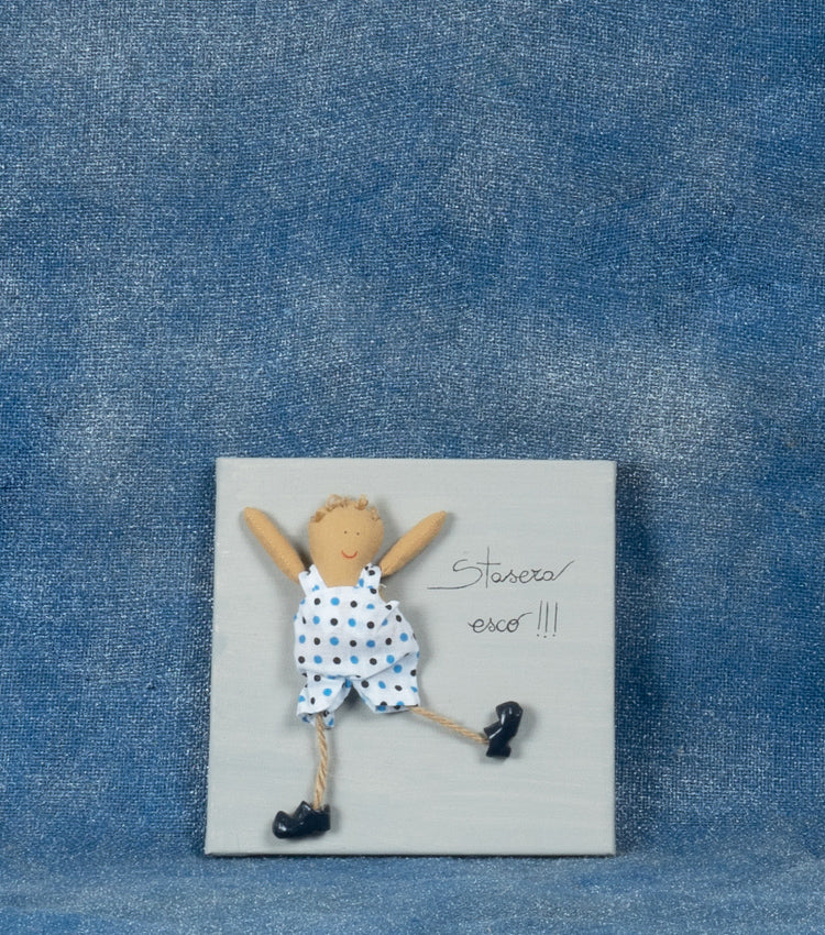 Quadro realizzato interamente in tela dipinta e decorata da noi con una bambola di pezza dipinta e imbottita con capelli e gambe di corda, scarpe di legno anch'esse dipinte e vestito di cotone di diverse colorazioni e una frase scritta con un pennarello. Nella parte posteriore è presente lo spago per appenderlo.