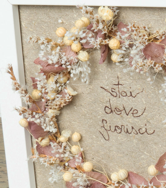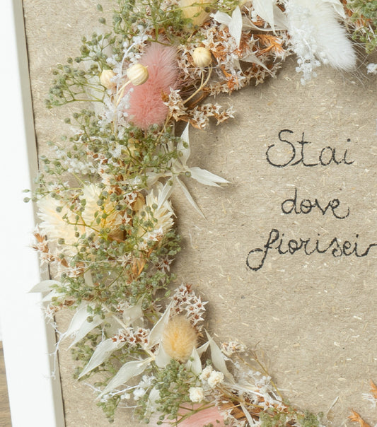 Cornice in legno piccola "stai dove fiorisci" con fiori essiccati e stabilizzati e carta di lino