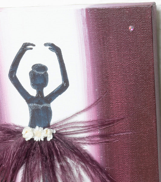Quadro in tela con una Ballerina, piume di Struzzo, fiori essiccati e brillantini