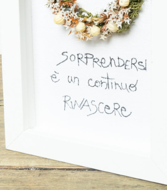 Cornice in legno "SORPRENDERSI è un continuo RINASCERE" con una Ghirlanda di fiori essiccati e stabilizzati e lino
