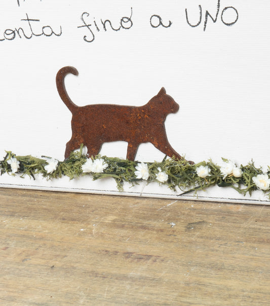 Quadro in tela "non essere IMPULSIVO... FAI COME ME: conta fino a UNO" con un Gattino in corten e fiori essiccati e stabilizzati