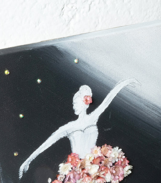 Quadro in tela con una Ballerina, fiori essiccati e brillantini
