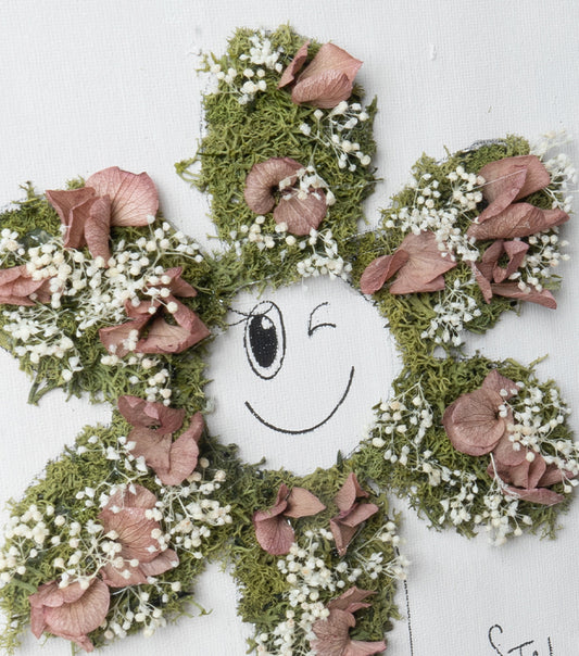 Quadro in tela "STAI dove FIORISCI" con un Fiore in Muschio e fiori essiccati