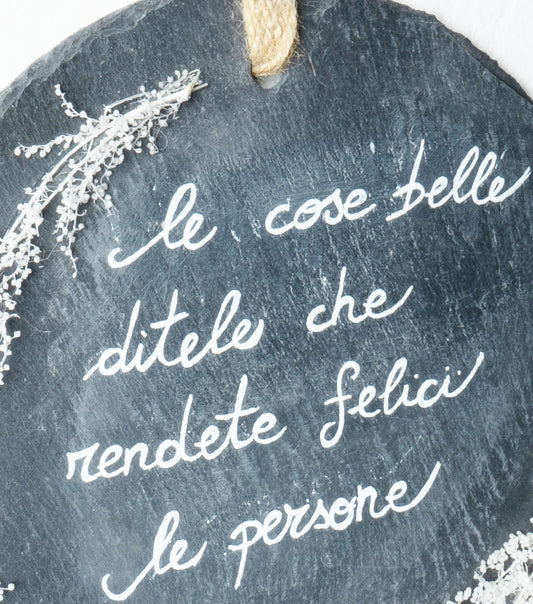 Lavagnetta "le cose belle ditele che rendete felici le persone" in ardesia con piante stabilizzate