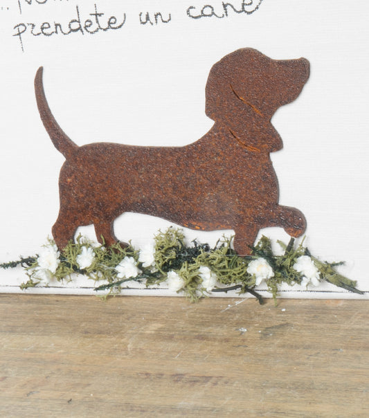 Quadro in tela "circondatevi di sole persone che...NO...niente...un cane, prendete un cane" con un Cagnolino in corten e fiori essiccati e stabilizzati