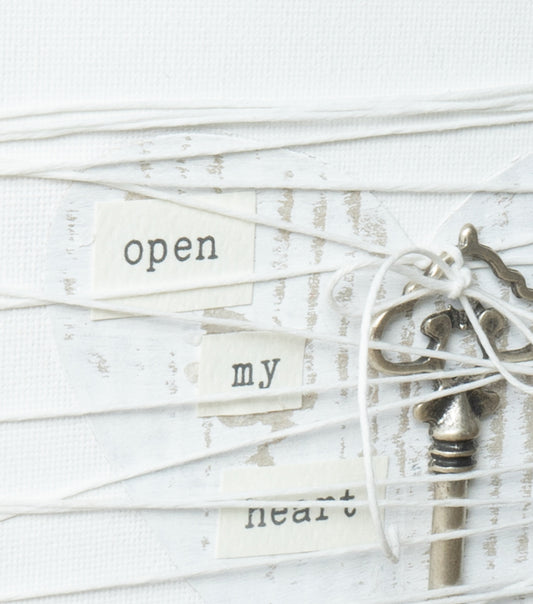 Quadro in tela "open my heart" con "La Chiave nel Cuore" in metallo, carta e spago
