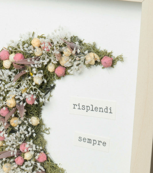 Cornice in legno "risplendi sempre" con una Mezza Luna di fiori essiccati e stabilizzati