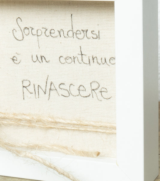Cornice in legno "Sorprendersi è un continuo RINASCERE" con un Bouquet di fiori essiccati e stabilizzati, lino e corda