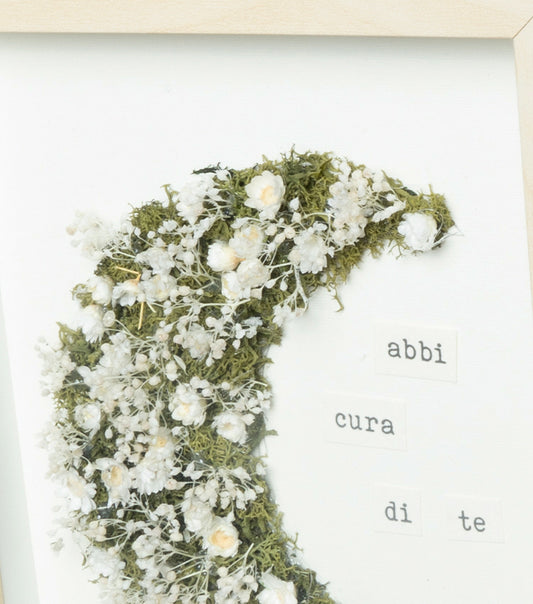 Cornice in legno "abbi cura di te" con una Mezza Luna di fiori essiccati e stabilizzati