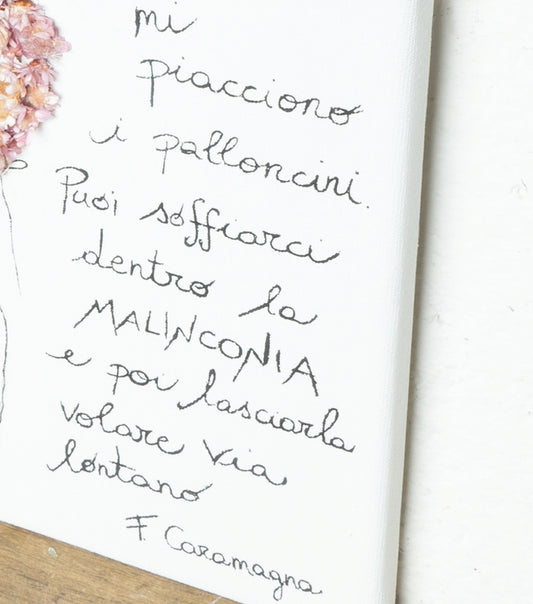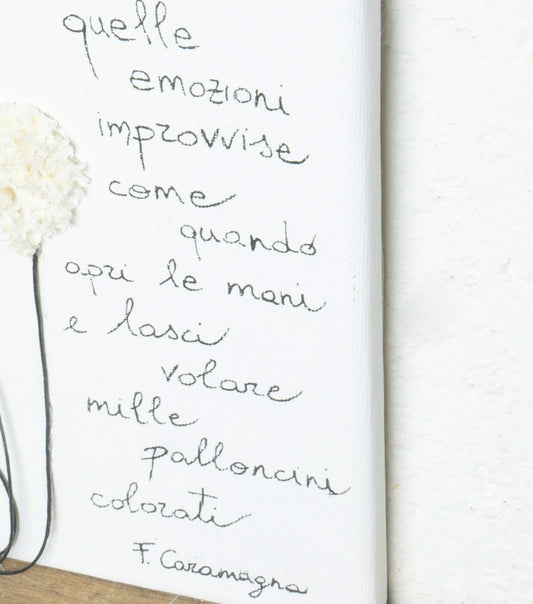 Quadro in tela con un aforisma di Fabrizio Caramagna, un Palloncino e fiori essiccati