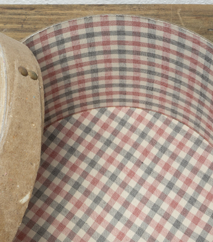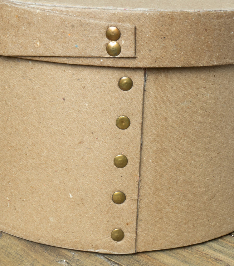 Scatola da appoggio con coperchio rimovibile realizzata in cartone lavorato e metallo dallo stile vintage e rustico con parte interna di cotone decorato di diverse colorazioni.