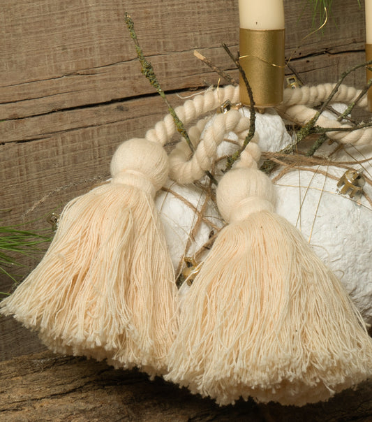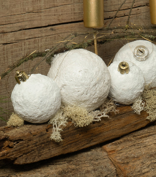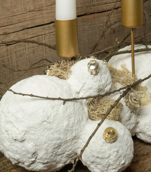 Porta-Candele Natalizio in metallo con Candele, Nappe in cotone, Sfere in cartapesta e metallo, muschio stabilizzato, legno, fil di ferro e spago