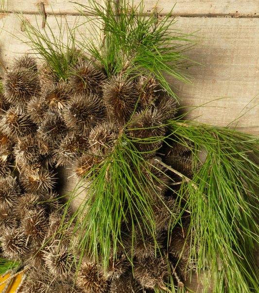 Ghirlanda Natalizia piccola con i Cardi essiccati, rami di Abete, velluto, corda e cotone