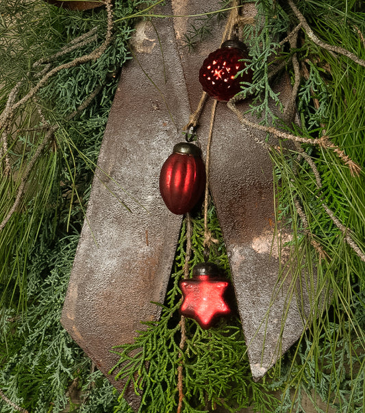 Fiocco Natalizio in corten con Sfere in vetro e metallo, rami di Conifere e spago