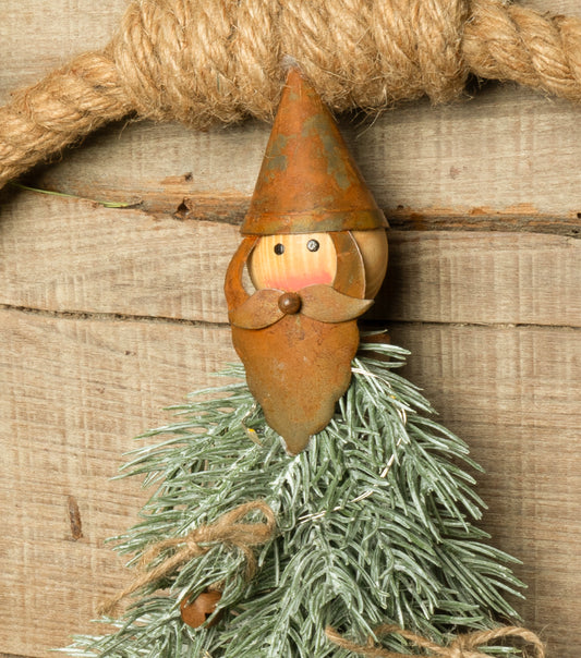 Ghirlanda Natalizia in metallo e corda con uno Gnomo in legno e metallo, rami di Abete sintetici, spago e fil di ferro