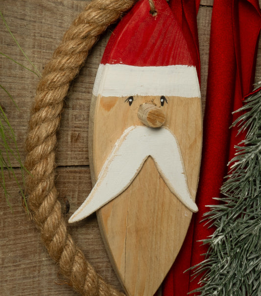 Ghirlanda Natalizia in metallo e corda con uno Gnomo in legno, rami di Abete sintetici, Stelline in legno, cotone, spago e legno