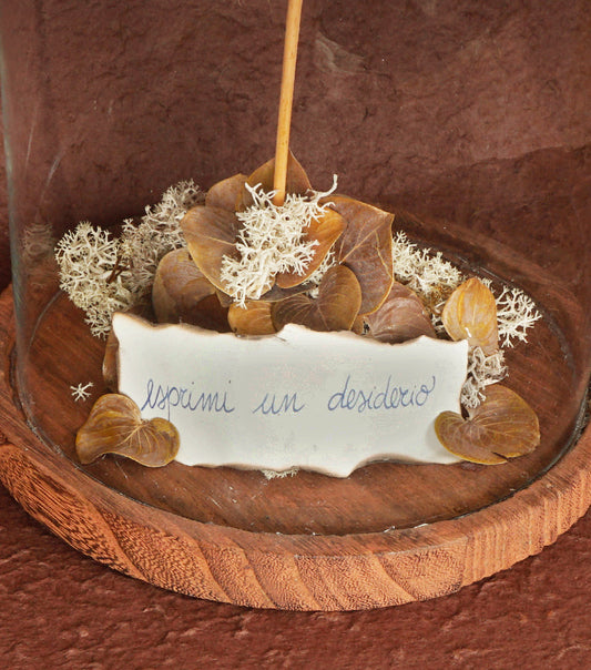 "Il Piccolo Soffione nella Boule" in vetro e legno con una scritta, carta e piante essiccate e stabilizzate