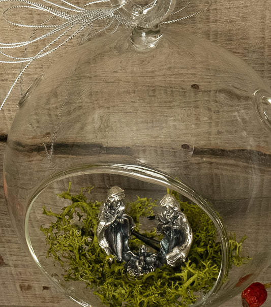 "La Natività nella Sfera" in metallo e vetro con muschio stabilizzato e spago