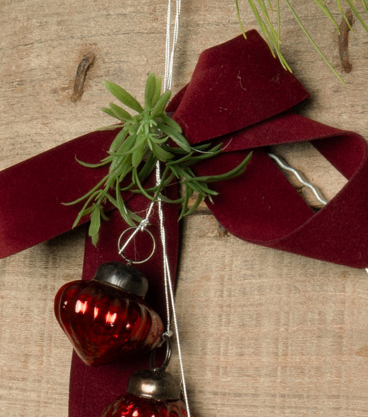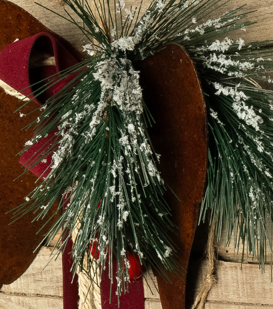 Decorazione Natalizia con le "Ali d'Angelo" in corten, Bacche e rami di Abete "Innevati" sintetici, velluto, corda e spago
