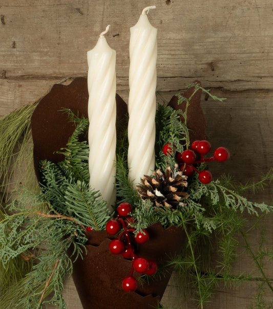 Porta-Candele Natalizio in metallo con Candele, un Abetino in corten, Bacche e piante sintetiche, Pigne, legno, foglie essiccate e fil di ferro