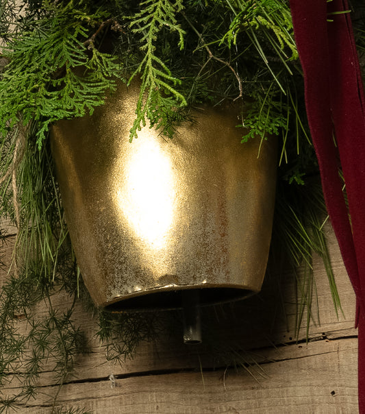 Campanaccio Natalizio in metallo con i rami di Conifere ed Asparagus, velluto e corda