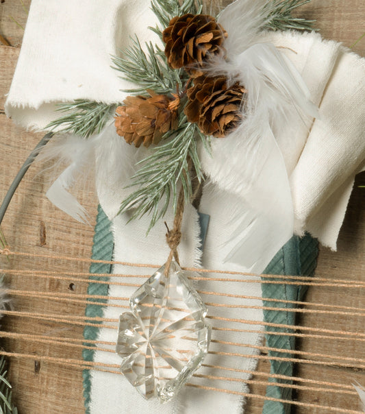 Ghirlanda Natalizia in metallo con una Perlina in vetro, Pigne, Piume, rami di Abete sintetici cotone e spago