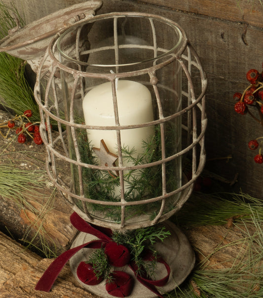 Lanterna Porta-Candela "Anticata" Natalizia in metallo e vetro con una Candela, Stelline in legno, Campanelli in metallo, rami di Asparagus, velluto e rami di Conifere sintetici