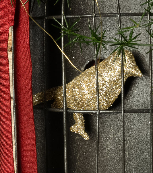 "L'Uccellino Brillantino nella Gabbietta Natalizio" in metallo con i rami di Conifere, Campanelli di velluto, cotone e fil di ferro