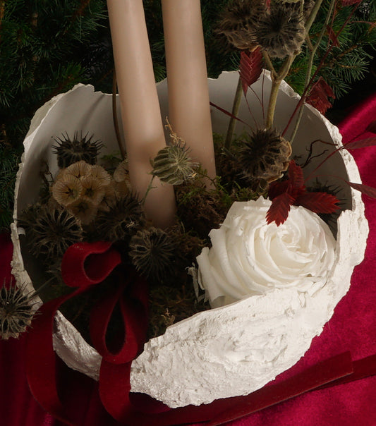 Centrotavola Natalizio su gesso con Candele, una Rosa, piante e Muschio