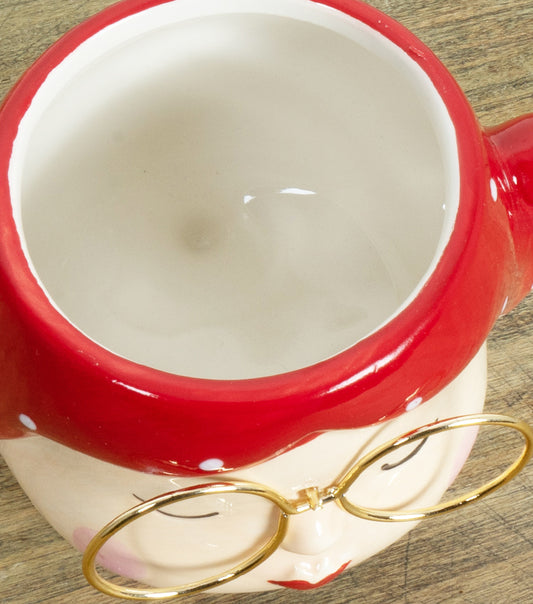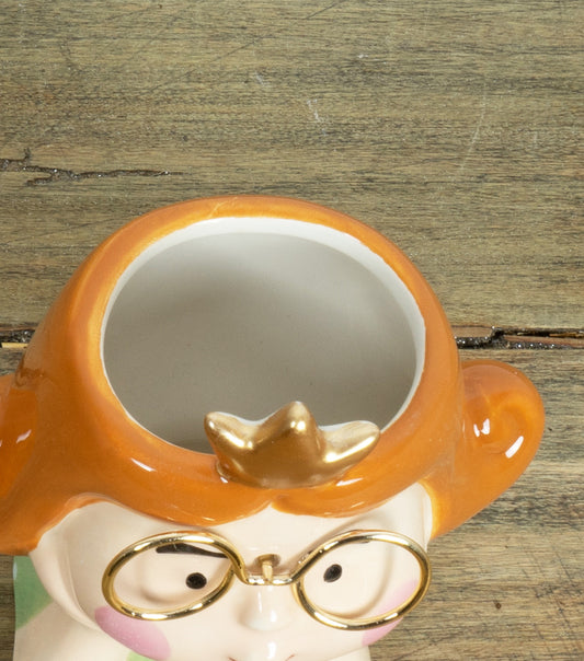 Vasetto con volto di una donna con occhiali e coroncina in ceramica e metallo