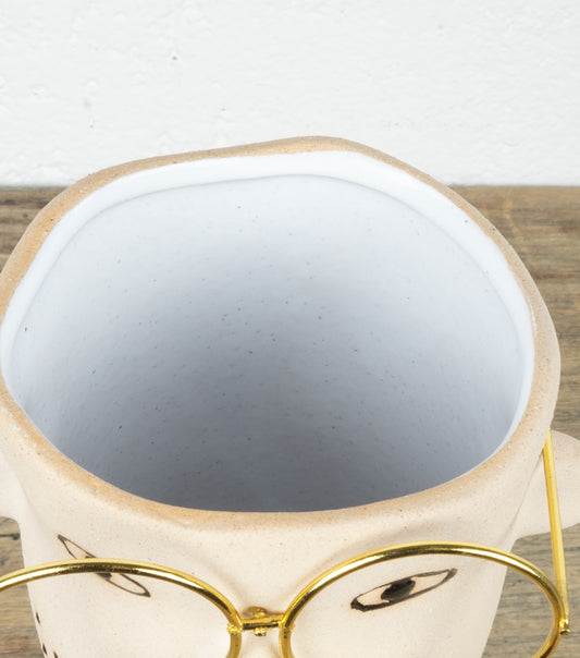 Vaso a forma di un uomo con gli occhiali in cotto e ceramica