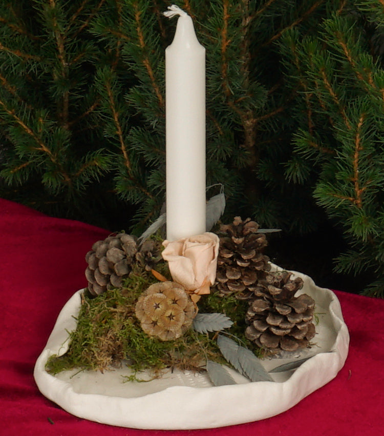 Candela Natalizia da appoggio realizzata interamente da noi con la base di terra cruda lavorata decorata con Pigne, Muschio e fiori e piante entrambi essiccati di diverse tipologie dallo stile vintage e rustico.